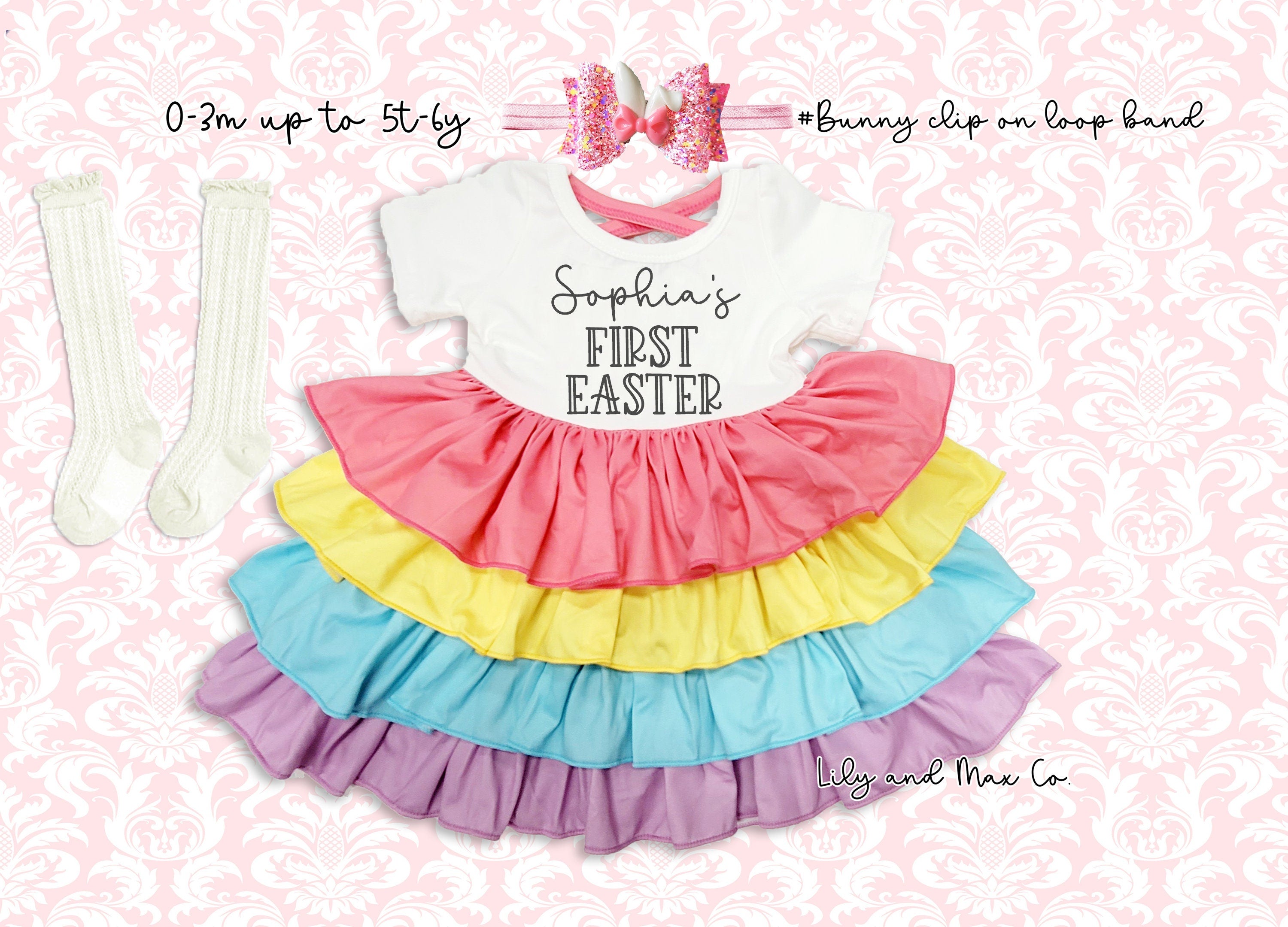 Easter girl Dress, 1st Easter baby girl outfit, Happy Easter girl kid toddler rainbow dress,