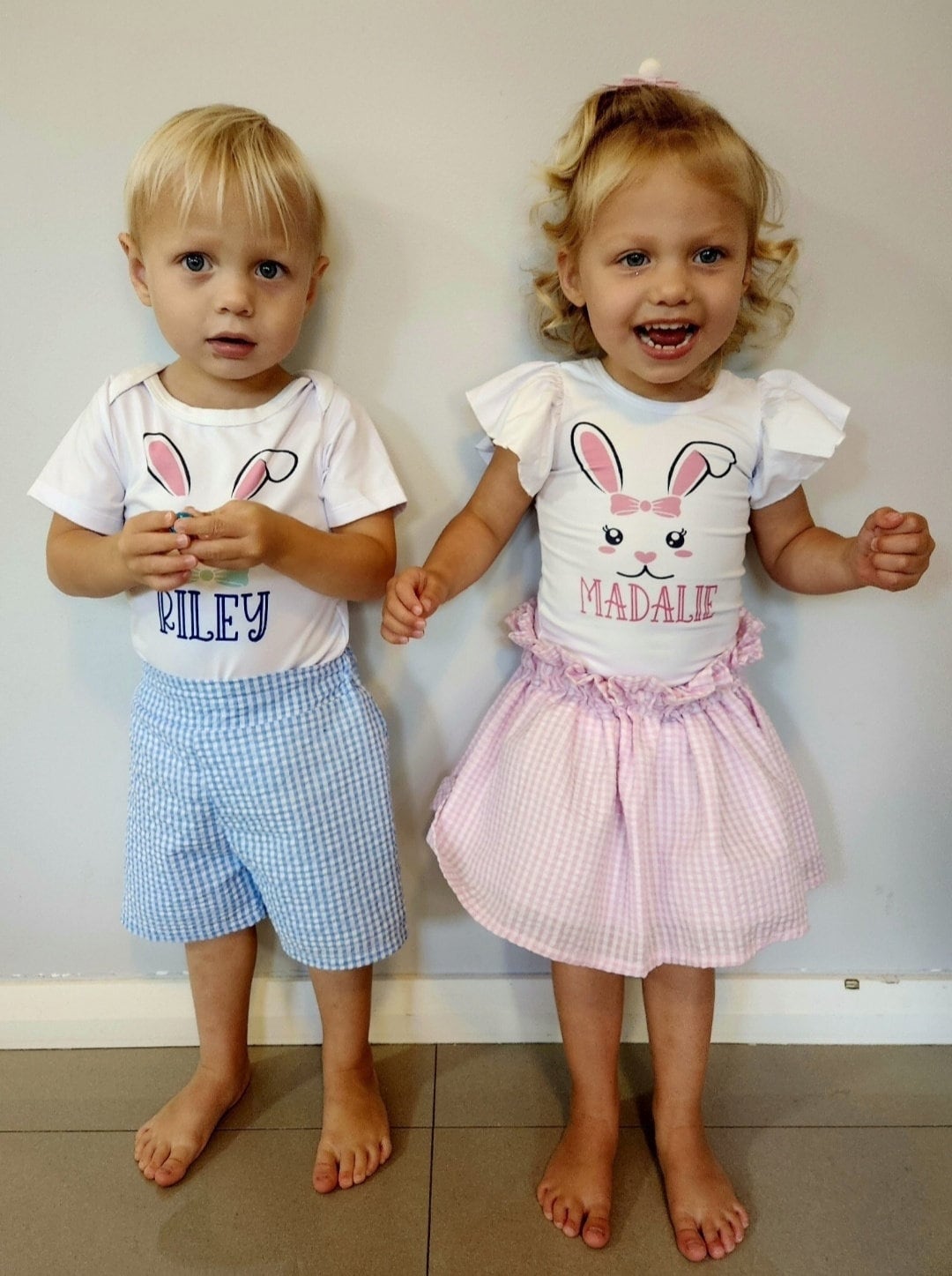 Personalized Seersucker Easter Outfit: Bunny Bodysuit, Skirt, or Shorts Set