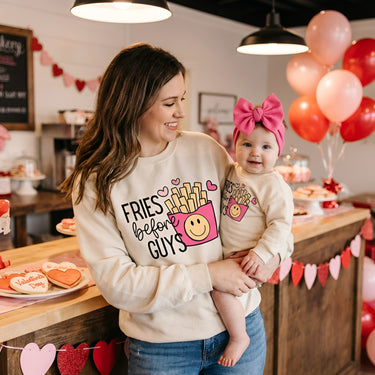 Fries Before Guys® Baby tee Outfit, Valentine's Day Sweatshirt bubble romper