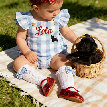 Dorothy baby Costume, Personalized Wizard of Oz romper outfit, red glitter shoes, Girls Halloween