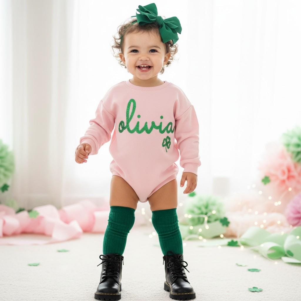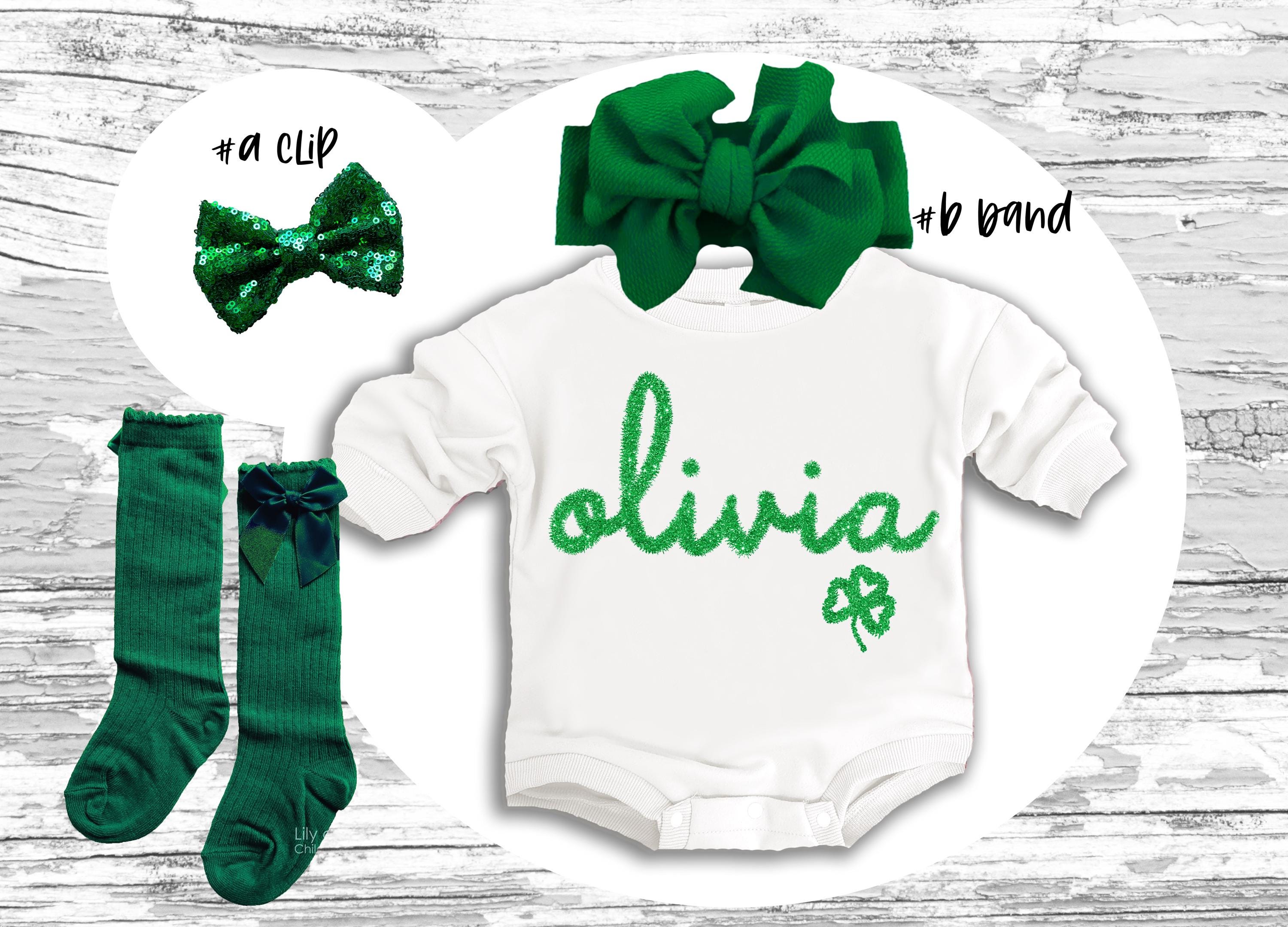 Personalized St. Patrick's Day Baby Outfit: Romper, Bow Clip, Headband & Socks