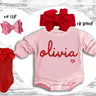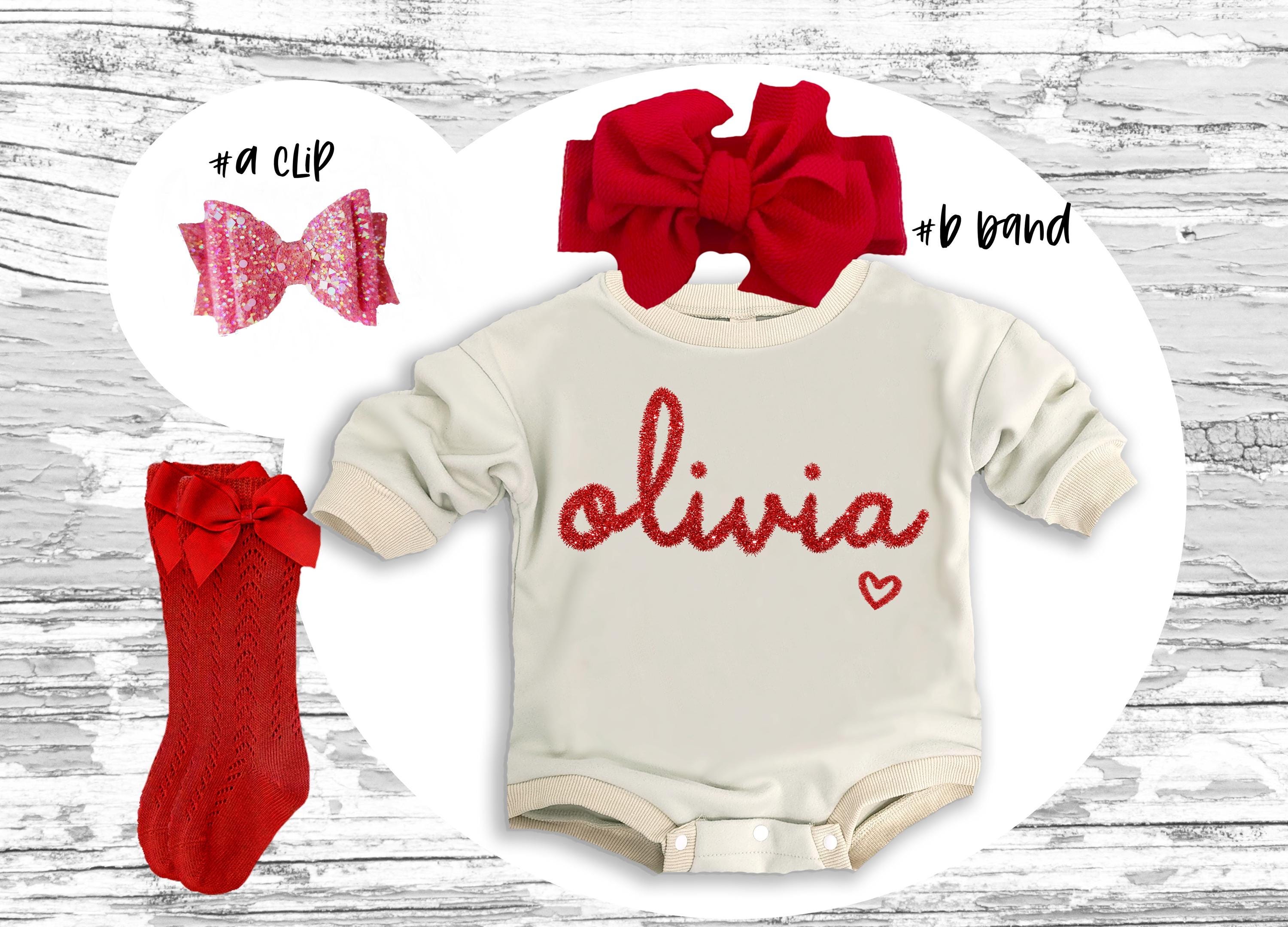 Personalized Valentines Baby Outfit: Romper, Bow Clip, Headband & Socks